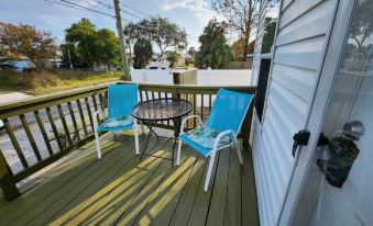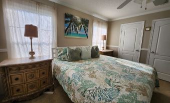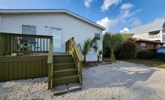 By the home, you have parking for 2 vehicles. Home sits on a well manicured lot with beautiful ground palms to complete this nice beachy space. Round charcoal BBQ grill sits near the wooden picnic table beside the porch (Charcoal and Starter fluid NOT PROVIDED). After a sandy day along the Gulf of Mexico, rinse off with the full size outside shower.