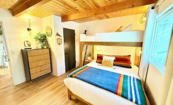 The loft features a sumptuous king-sized bed, creating a cozy, elevated experience. Downstairs, the first level is thoughtfully designed to maximize comfort and privacy. It includes a comfortable queen bed and a charming twin loft bed, ideal for couples, small families and friends. Each bedroom is equipped with air conditioning, black-out curtains, and a fan, ensuring a restful sleep no matter the season.