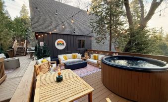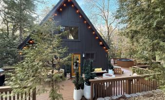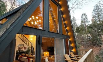 Welcome to The Avian, an A-frame cabin nestled in the serene woods of Lake Arrowhead. This two-bedroom retreat is an architectural gem, blending classic '70s design with modern luxury. As you step inside, you're greeted by the expansive glass façade offering an unobstructed view of the forest.