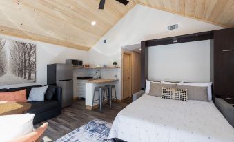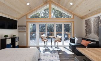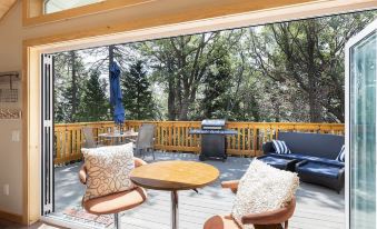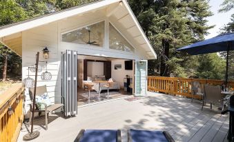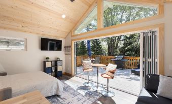 The space has flexibility for whatever you desire most in terms of experience. Feel like outdoor living? Then open the glass doors completely & immerse yourself in nature. Feel like doing a Zoom call for work? Then close the glass doors, let everyone else play on the deck open your laptop, & focus on work for an hour. The cathedral ceilings and large windows create lots of light & space. The ceiling fan keeps the air going for a comfortable time inside. The kitchenette with an induction cooktop is a great way to cook your own meal without heating up the entire space. Or, you can do traditional BBQ on the grill and enjoy the solitude of the trees.