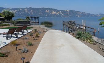 This lake front home is in a forest setting with many large pine and oak trees on the property. A small gravel road off the main street leads down to the home and there is plenty of parking for several cars and boat trailers however it may be difficult for some as it is a narrow road with tight turns so we don't recommend trailers longer than 20 feet. Jet Ski's and Sea Doo's are welcome to use our launch ramp on the property and boats should launch in town at Red Bud park or the free ramp at Clearlake Oaks which is just across the water from this home.