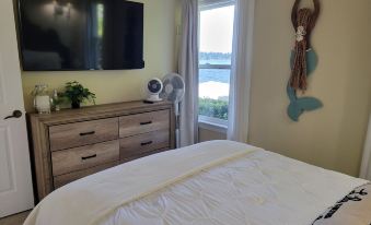 As you walk in the front door, you will see nothing but “Lake” out of every window. To the Right is the clean & modern Bathroom complete with Jetted Tub. Straight ahead is the bedroom with a queen size “Pillow Top” mattress. (We have had many positive comments on how comfortable the bed is.) A big screen TV & views of the lake out of the bedroom windows as well. To the Left is the eating bar, & open feel Kitchen that offers a drip / pod coffee machine, microwave, small oven / stove, air-fryer & full-size refrigerator w/ice maker. To the right of the Kitchen area is the Living room with a queen size Hide-a Bed with “Foam Topper”.