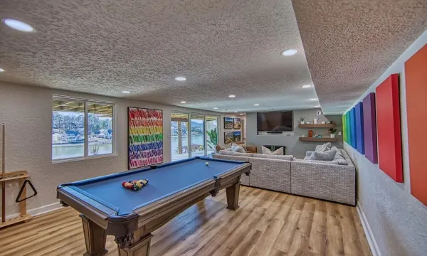 The upstairs living room shares a large space with the main kitchen and features wall-to-wall windows for a great view of the lake, and the downstairs living room doubles as a play room with an awesome pool table. There's also a full drink bar down there, with a small fridge and microwave. Curl up with the fam on the ultra-comfortable sectional downstairs and watch a movie - the 65" TV is equipped with a great Sonos soundbar.