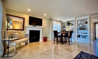 Entering into the open concept living and entertainment area, the room is immersed in natural light echoed by the shimmering sun glistening off the lake. You'll immediately be drawn to the large glass doors that open up onto your private balcony where you can enjoy patio dining and seating. Too cold outside? Light yourself a fire in our wood-burning fireplace.