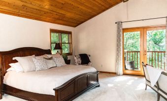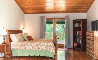 The bedroom, in the downstairs area, has a queen bed and opens to a patio with a hammock. The separate bathroom has a large clawfoot tub with a hand-held shower.