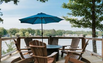 An additional deck, overlooking the boat dock, features Adirondack chairs and a gas fire pit