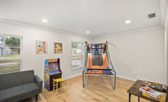 Pac-Man and Mortal Kombat, a basketball set, and competitive board games for all ages. The game room also has a futon, great for lounging and playing board games. Perfect for families, friends, or anyone who loves a little healthy competition. Whether it's an intense basketball match or reliving old-school arcade classics, the game room is guaranteed to be a highlight of your stay. Includes a Pac-Man machine and Mortal Kombat machine with a combined 18 games.