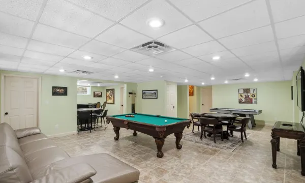 In our lower level, you will find endless entertainment, equipped with a state-of-the-art home theater, professional pool table, dart board, poker table, bar with ice maker, 400 game arcade with a walk-out to a brand new heated saltwater pool and outdoor kitchen which includes stovetop, bbq, refrigerator, plates/utensils and sink (propane provided). It also features an outdoor shower for rinsing, and 12-14 person outdoor dining area, with outdoor speakers for music. This entertainment area also offers a large bathroom with an exit to the outdoor deck, making lake cleanup much easier. Life jackets and fishing poles are stored here as well for guest usage.