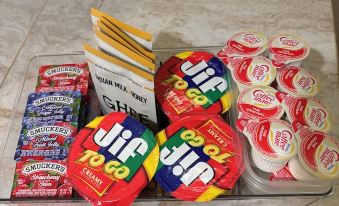Kitchenette includes sink, Keurig with coffee and hot chocolate pods, toaster oven, toaster, microwave, blender, hot plate with 2 basic pans for boiling or frying, large crockpot, Instapot upon request, flatware, dishes, paper plates, towels, and utensils. Individual serving condiments of coffee creamer, jelly, peanut butter, butter, ketchup, mayo and mustard are supplied. Snacks and spices also offered in the kitchenette.
