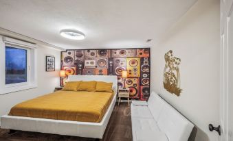 Main bedroom has a new king size memory foam mattress with all new bedding and pillows. Retro couch folds out into a single sleeper (would fit 2 kids). Dimmable and color changing light in the ceiling fan, full length mirror, and live stream TV. Music themed with a wall of speakers.
