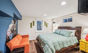 Second bedroom has an incredibly comfy queen bed with all new pillows and beddin. Oscilating fan, full length mirror, live stream TV and retro couch. A fun and colorful Banksy DJ Monkey, live moss, and vintage records grace this room.