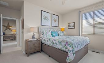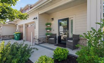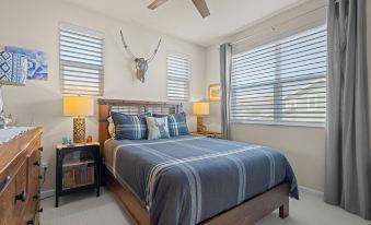 Three bedrooms the primary bedroom has a king bed and an en suite bathroom with dual sinks and a walk in shower. The second and third bedrooms each have a queen size bed and share the full bathroom with bathtub. Currently the third bedroom is being used as an office but will have a brand new queen bed prior to summer. This property boasts a brand new deck overlooking the green space and a small stream