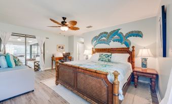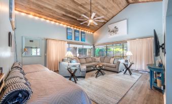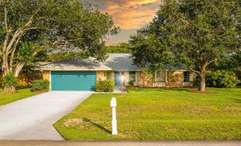 The perfect blend of relaxation and adventure awaits in this spacious, serene oasis, just 15 minutes to Vero Beach, Downtown Fort Pierce, and the Jetty! This coastal 3-bed, 2-bath home boasts vaulted ceilings, a split floor plan, and spacious bedrooms, comfortably sleeping 10. Enjoy an open living area, a screened-in pool, a large lanai, and vibrant murals by a local artist. Unwind by the pool, visit the nearby beach, or swing a few clubs at the Island Pines Golf Course, located just a block away. The home offers a king bedroom with a daybed and two twin beds, a second king room with a twin bed and a child-sized pull-out, and a cozy queen room. The living room also features two daybeds, ensuring everyone has their own space to relax and enjoy. The garage has been converted into a game room, complete with an Xbox, 55” TV, games, puzzles, and bikes for all ages. Electric scooters are available to rent for $20/day (max $80). Located in a golf community with 9- and 18-hole options, just $25/per person, fees include a golf cart!
