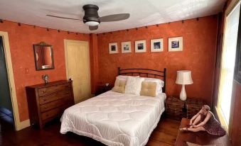 Bedroom: queen sized bed with hybrid mattress , ceiling fan, dresser, table for laptop and closet with drying rack, ironing board, iron and emergency light.