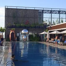 У отеля нет своего пляжа. бассейн на крыше. Нормальный отель за свои деньги - 120 евро с завтраком в декабре. Завтрак солидный, но в основном азиатская еда