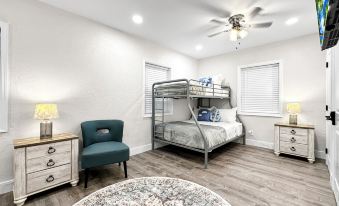 The property consists of 3 bedrooms and 1 bathroom. The primary bedroom has a queen bed, the smallest bedroom has another queen bed, and the final large bedroom has a queen bed and twin over full bunk bed.