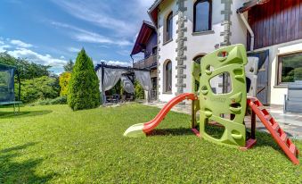 Large single-family house "Zameczek Falsztyn", built in 2000, renovated in 2009. 5 houses in the resort. On the outskirts, in a quiet, sunny, elevated position, 2 km from the lake, 5 km from the skiing area, in the countryside. Private: property 1'500 m2 (fenced), garden. Terrace, barbecue, children's playground (swing). In the house: sauna, hot tub, billiard table, table football, storage room for skis. Motor access to the house. In Winter: please take snow chains. Parking at the house, single garage. Shop 2 km, grocery 500 m, supermarket 2 km, restaurant 5 km, bus stop 150 m, railway station 20 km, sandy beach 2 km (small), bathing lake 2 km. Tennis 10 km, riding stable 3 km, ski lift 5 km, chair lift 5 km, ski rental 5 km, ski school 5 km, ice rink 20 km, children's playground 2 km. Nearby attractions: Zamek Niedzica 3 km, Ruiny Zamku Czorsztyn 15 km, Niedzica Park Miniatur, Park linowy, paintball. Well-known ski regions can easily be reached: Niedzica 6 km, Białka Tatrzańska 18 km, Bukowina Tatrzańska 24 km. Well-known lakes can easily be reached: Jez. Czorsztyńskie 2 km. Please note: car recommended. Suitable for families, baby equipment (included). Fishing [permit required]. Main road 50 m from the property. 6-room house 270 m2 on 2 levels. Open living room 32 m2 with open-hearth fireplace, satellite TV, video and DVD. Exit to the garden, to the terrace. Open dining room 18 m2. Exit to the garden, to the terrace. 1 room 13 m2 with 1 double sofabed (140 cm, length 200 cm), shower. Kitchen 13 m2 (dishwasher, 4 ceramic glass hob hotplates, microwave, electric coffee machine). Sep. WC. On the lower ground floor: 1 room with bar. Sep. WC, Sauna. Upper floor: 1 room 15 m2 with 2 beds (90 cm, length 200 cm). Exit to the balcony. 1 room 15 m2 with 1 double bed (160 cm, length 200 cm). Exit to the balcony. 1 room 18 m2 with 1 bed (85 cm, length 200 cm), 1 french bed (140 cm, length 190 cm). 1 room 28 m2 with 1 double bed (180 cm, length 200 cm), bath/WC. Exit to the balcony. Shower, sep. WC. Electric heating, wood heating, boiler (300 litres). Balcony, 2 terraces 25 m2. Terrace furniture. Beautiful view of the lake, the mountains and the valley. Facilities: washing machine, sauna, iron, children's high chair, baby cot for up to 3 year olds, hair dryer. Internet (WiFi, free). Parking, garage. Please note: suitable for families. Smoke alarm.