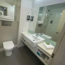 Ванная комната была тесной и плохо спроектированной. Раковина расположена прямо рядом с туалетом, который, в свою очередь, находится рядом с ванной. Отдельной душевой кабины нет, поэтому приходится залезать в старую ванну, что неудобно и создает ощущение «бюджетного мотеля».