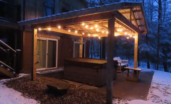 After a day of hiking and exploring, come take a relaxing soak in the private 6 person hot tub fully covered under a pavilion. It's conveniently just a few steps from the lower level queen bedroom and living area. On the patio next to the hot tub is a log sofa rocker where you can star gaze until your heart's content.