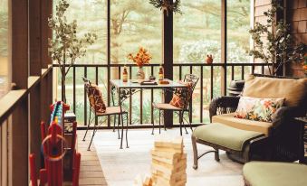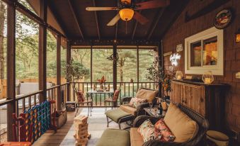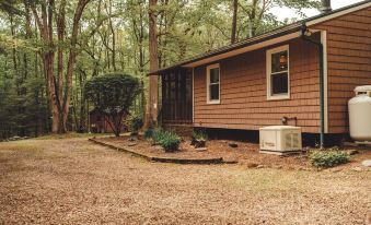 • Covered porch—perfect for relaxing while listening to the rain in the woods