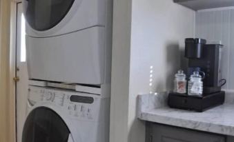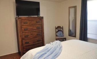 The main living area in this mobile home is open-concept and very comfortable and spacious. The living area boasts a 65-inch smart TV, a record player, and a cozy atmosphere. The well-appointed kitchen has new appliances, a keurig, and dining area. We leave a few snacks, waters, and coffee pods for your convenience.