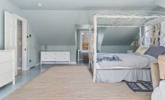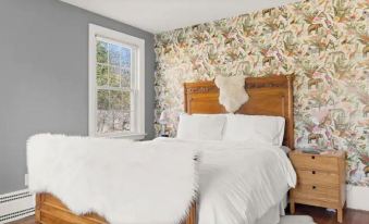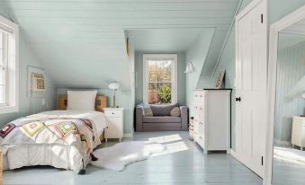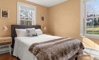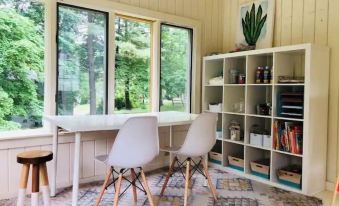 The huge, sun drenched primary bedroom is an oasis with a beautiful clear balcony overlooking the yard and forest beyond - feels like a luxurious treehouse dwelling! There is an office nook with a Parsons table (perfect for remote work with fast, reliable internet) and ensuite full bath. There is also a comfortable couch (serving as a bonus sleeping spot for the kids on more than one occasion) to relax with a cup of tea while taking in the natural beauty beyond the balcony. The second upstairs bedroom is spacious and has two twin beds, a cozy reading nook and its own half bath. There are two comfortable bedrooms on the first floor - one with a queen bed and one with a full size bed. Full bath with bathtub on the first floor as well. Plenty of closets and dressers to store your belongings during your stay.