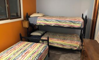 We know that people come here for everything that surrounds us, but the house itself is pleasant and comfortable. The main living space is upstairs: kitchen, dining area, living room with fireplace, bedroom, washer-dryer and full bath; there's AC in the upstairs bedroom for the rare days when it's needed (and we're trying to add it throughout the upstairs). Downstairs are the bunk room and another bedroom, a family room and a bathroom with tub. The nights are cool even in the middle of summer; good thing there's a little fire pit out back.