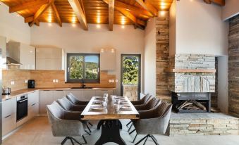 The beautiful natural stone villa combines traditional design with luxurious comfort and offers a variety of amenities that will make your stay unforgettable. The inviting swimming pool provides refreshment on hot summer days and invites you to spend relaxing hours outdoors. The lounge area is perfectly designed to spend cosy evenings with family and friends and enjoy the breathtaking views. Inside the villa, we have an open fireplace that provides both cosy warmth and a homely atmosphere.