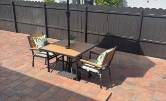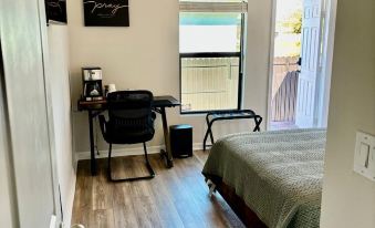 The studio features a small designated work area, a private bathroom, and a lovely patio with a fence separates the studio from the main house, ensuring privacy through out your stay.