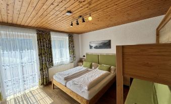 Apartment block "Ertlschweigerhaus", 1'000 m a.s.l., 3 storeys. 5 apartments in the residence. Above Donnersbach, in the district of Furrach, 9 km from the skiing area. For shared use: patio. In the house: reception, lounge, WiFi, sauna, infrared sauna, relaxation room, table tennis (all included), storage room for bicycles, storage room for skis, central heating system. Bread roll service. Parking at the house. Supermarket 3.5 km, restaurant 10 m, bus stop "Ertlschweigerhaus Planneralmstr." 65 m, thermal baths "Grimming Therme" 32 km, bathing lake "Putterer See" 12 km. Golf course (14 hole) 11 km, chair lift 9 km, ski rental 9 km. Nearby attractions: St. Aegidius Kirchenruine 2 km. Well-known ski regions can easily be reached: Planneralm 9 km, Riesneralm (Donnersbachwald) 13 km, Hauser Kaiblng 38 km. Well-known lakes can easily be reached: Putterersee 12 km. Hiking paths: Donnersbachklamm 4 km. "Furrach", 3-room apartment 65 m2 on 1st floor. Object suitable for 4 adults + 2 children. Cosy furnishings: living/dining room with dining nook. Exit to the balcony. 1 double bedroom with satellite TV and international TV channels (flat screen). Exit to the balcony. 1 room with 1 x 2 bunk beds, 1 double bed, satellite TV and international TV channels (flat screen). Open kitchen (oven, dishwasher, 4 induction hot plates, toaster, kettle, microwave, electric coffee machine). 2 showers/WC. Heating. Parquet floors. 2 balconies. Balcony furniture. Facilities: Internet (WiFi, free). Please note: non-smokers only. Maximum 1 pet/ dog allowed.