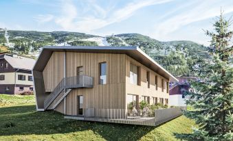 Modern apartment block "Hideaway Planneralm by Jufa Hotels", 2 storeys. 7 apartments in the residence. In the district of Planneralm 12 km from the centre of Donnersbach, in a quiet, sunny position, 3 km from the lake, 100 m from the skiing area, in the countryside. In the complex: storage room for bicycles, storage room for skis, central heating system. Parking at the house. E-charging station. Supermarket 12 km, restaurant 100 m, bus stop "Planneralm Rotbühellift" 45 m, outdoor swimming pool 22 km. Golf course (18 hole) 20 km, walking paths from the house 10 m, ski lift 100 m, chair lift, skisport facilities 100 m. Nearby attractions: Donnersbachklamm 13 km, Grimming Therme Bad Mitterndorf 35 km, KULM Skiflugschanze 33 km, Kirchenruine St. Aegidius 12 km. Well-known ski regions can easily be reached: Planneralm 100 m. Well-known lakes can easily be reached: Plannersee 3 km, Putterersee 21 km. Hiking paths: Donnersbachklamm 13 km. The photo is just an example. All houses/apartments are individually designed/furnished. The holiday properties may differ in situation, size and location. "Appartement für 6 Personen", 3-room apartment 55 m2 on 2 levels. Bright, modern furnishings: upper floor: living/sleeping room with 1 double sofabed, dining table, satellite TV and international TV channels (flat screen). 1 double bedroom. Kitchenette (oven, dishwasher, 2 ceramic glass hob hotplates, toaster, kettle, electric coffee machine). Bath/shower, sep. WC. Heating. 2nd upper floor: 1 open double bedroom with sloping ceilings. Facilities: hair dryer. Internet (WiFi, free). Please note: non-smokers only. Maximum 1 pet/ dog allowed. The property is one of a type of property or apartment.