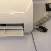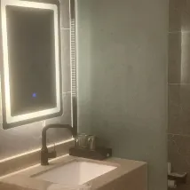 Комната очень маленькая, некуда положить вещи, вода из душа разбрызгивается во все стороны, розетка перед зеркалом, кажется, отваливается, если приложить немного усилий, при включении чайника чувствуется кислый запах, вытяжка и свет в ванной включаются одновременно, что является антигуманным дизайном, кондиционер очень старый, и я не решаюсь его включать, место для развешивания одежды — хитроумный дизайн напротив душа, в любом случае, это большая ошибка.