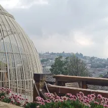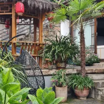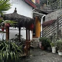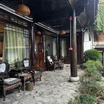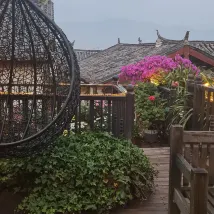 Hotel is at the top of a hill. Owner met us on a Main Street and helped us with our luggage on the first day of arrival. Room is an ancient wooden style. Nice garden with succulents and flowers through the hotel. Although hotel has a hotpot restaurant that is open to public, we were not disturbed by noise in the evening. From the hill top, we can see the mountain afar. Hotel’s breakfast of noodles, eggs, buns and pickles is nice. Porridge is plain. Would be good with some minced meat sauce. Going to ancient town requires a walk down some steps leading direct to the busy and beautiful streets. Overall a nice place. 👍