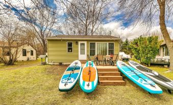 Walk-out lakefront access, four 2-person paddleboards (that can also be used similarly to kayaks), a 100" projector screen, knotty-pine walls, modern and fresh renovations, and comfortable furnishings, all complete the Pelican Bay Cabin.