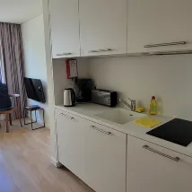 Самостоятельная регистрация заезда у лифта оказалась довольно интересной. Номер очень просторный, оснащен кухонными принадлежностями, так что мы купили пиццу, жареную курицу и поели прямо в номере. Отличное соотношение цены и качества. Отель расположен недалеко от станции метро.