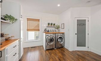 The fully equipped kitchen features rich wood counters, modern appliances, and plenty of space for cooking or gathering around the island. A dedicated coffee & tea station adds that warm, hotel-like touch. You’ll also appreciate the private laundry room—perfect for longer stays or added convenience.