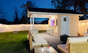 • A detached back building equipped with a bar top, sink (turned off in the winter), fridge, and smart TV makes entertaining easy and keeps refreshments close at hand.