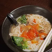 Мы приехали уже в 23:00, моросил дождь. Хозяин с женой пришли на парковку с зонтиками, чтобы помочь нам с багажом. Хозяйка даже приготовила нам две порции лапши, что было очень любезно.