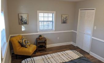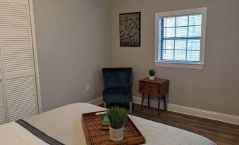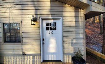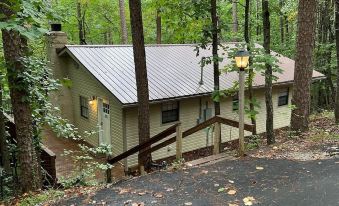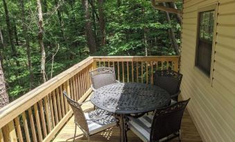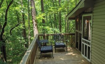 This cozy cabin in the woods has 2 bedrooms, each with a queen size bed. There is a tiled walk in shower in the full bathroom. The kitchen with granite countertops is fully stocked with everything you need to make a delicious family meal. The kitchen is open to the spacious living room with smart TV. Turn the breakfast into your home office with reliable high speed internet. Or, get away from tech and back to nature as you sit in rocking chairs on the quiet screened porch with nothing in sight but trees and wildlife.