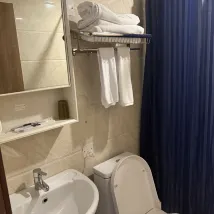 Однако комната довольно тусклая, с недостаточным освещением и узким пространством. Туалет большой, но в нем нет места для столешницы, разделение на сухую и мокрую зоны неочевидно, а в комнате есть комары. В трехместном номере всего 2 вешалки.