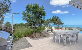 One of the highlights of this hilltop retreat is the outdoor space. A sprawling terrace surrounds a private salt water heated pool, inviting you to take a refreshing dip while enjoying the unobstructed views that stretch across the mountains and ocean. Comfortable loungers and an outdoor dinning area provide the ideal setting for leisurely afternoons spent basking in the sun or sipping cocktails as the sun sets behind the rainforest.