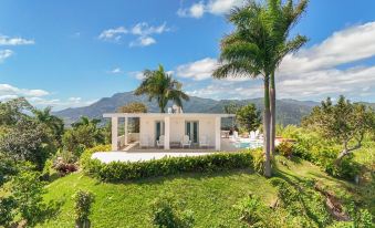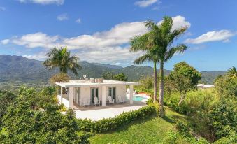Nestled atop a lush hill at the beachfront town of Ceiba, this 2-bedroom house is a haven of luxury & tranquility, offering a spectacular panoramic view of the ocean, the rainforest, mountains & neighboring islands. As you approach the property, a winding driveway bordered by vibrant, blooming flowers leads you to the entrance, setting the tone for the enchanting retreat that awaits.