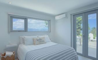 The master bedroom, strategically positioned to offer privacy and convenience, is a sanctuary of comfort. A queen-sized bed is the focal point with a Smart TV mounted on the wall to enjoy movie nights. Large glass doors open onto a the patio where you can savor your morning coffee while basking in the sunrise over the ocean. The ensuite bathroom is an open concept, spa-like retreat, featuring a shower with views to the rainforest.