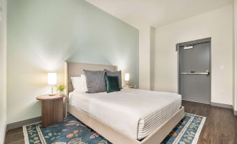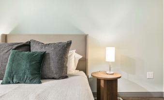 - Queen bed with soft linens and layered textures