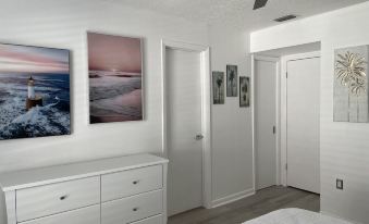 -Both bedrooms have a king bed and wonderful linens, pillows and comforter. There are extra linens for all beds and every sleeper has at least two pillows. Touch lights on each side of the beds have an outlet and 2 USB ports for easy phone charging. Overhead ceiling fans are remote controlled. There are light blocking blinds and large closets. Dressers in each room for guest storage, ironing board and iron with spray starch, lint roller, shelving to hang clothes and lots of hangers. Also in the closets are extra bath, beach towels, and extra linens.