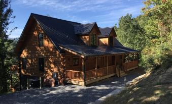 Our other family cabin is down the mountain just 5 minutes with a more level access and covered parking. We made it larger than Serenity now that our family has expanded so 4 Loves Lodge main cabin is a 5 bed, 5 ½ bath log home that sleeps 22, with a separate efficiency that sleeps 2.