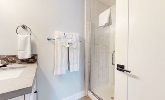 Upstairs loft: Queen bed + three twin beds, 45” Smart TV, and a full bathroom with a shower — ideal for families or groups.