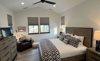 Upstairs Primary Suite: King-sized bed, en-suite bathroom, with large walk-in closet and stylish decor.