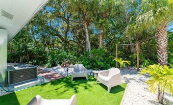 This cute little, private house was perfect for our stay. Lush vegetation outside and very comfortable inside. We used the pool and hot tub daily as well as walking to the beach. The walk to the beach is about a 3 minutes. Restaurants right in town or drive across the bridge to find more. We will definitely return.