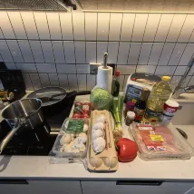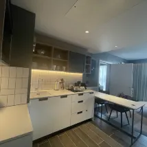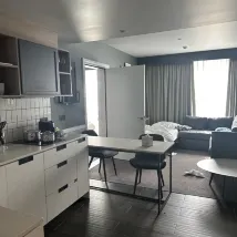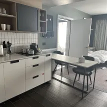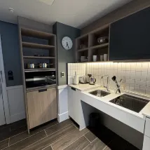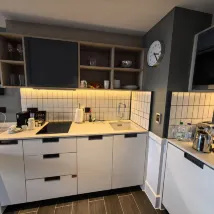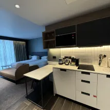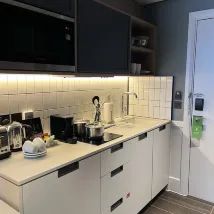 Комната полностью оборудована кухонной утварью (к моему удивлению), в небольшом холодильнике есть формочки для льда и отделения для фруктов, микроволновая печь, индукционная плита, тостер, кофемашина, электрический чайник и посудомоечная машина. Использование. Помимо мусорного бака в туалете, есть только один, расположенный под умывальником на кухне. Каждый раз, когда вы выбрасываете мусор, вам придется открывать дверцу шкафа, чтобы вытащить его. удобно, если в гостиной будет дополнительный небольшой мусорный бак.